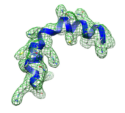 Close-up view of fitted structure (blue), target (correct) structure (green) and target density (green grid).